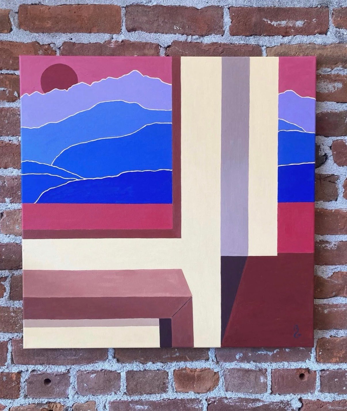 This painting is in oil on canvas measuring 24”x24”. It features a dreamy warm colorscape with Discovery Bay through an open doorway and in a framed picture on the wall. It is a playful expression of art (on the wall) imitating life (from the home’s view) - or perhaps life imitating art.