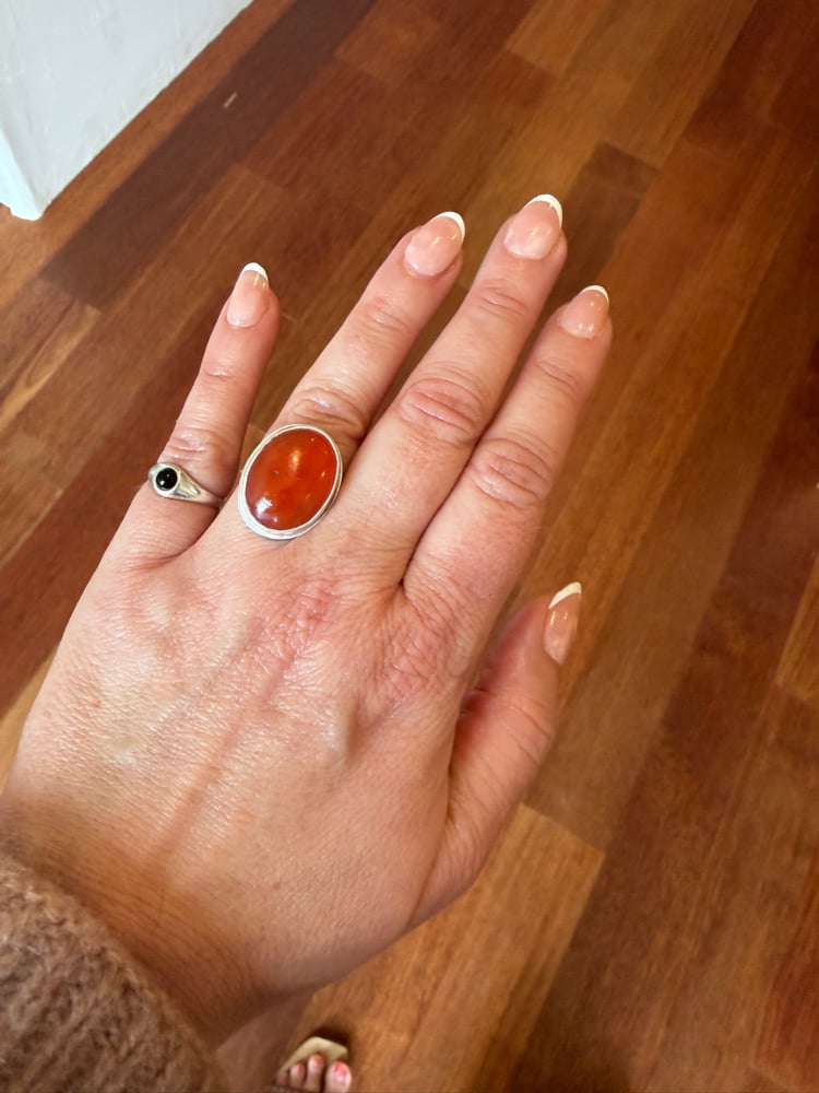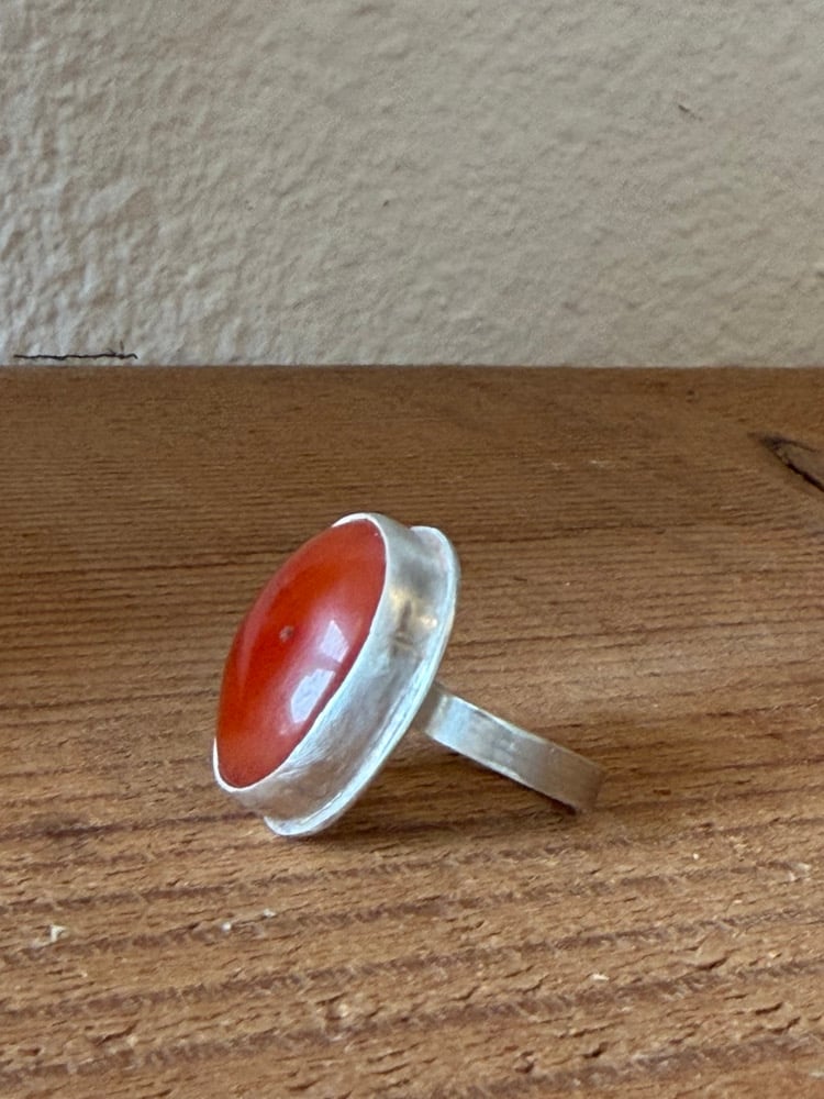 Size size 6.75 Carnelian and Sterling Silver Ring. I can’t get over the juiciness of this Carnelian in the sunshine. The band is imprinted with corn husk tying this ancient stone to the living earth today.