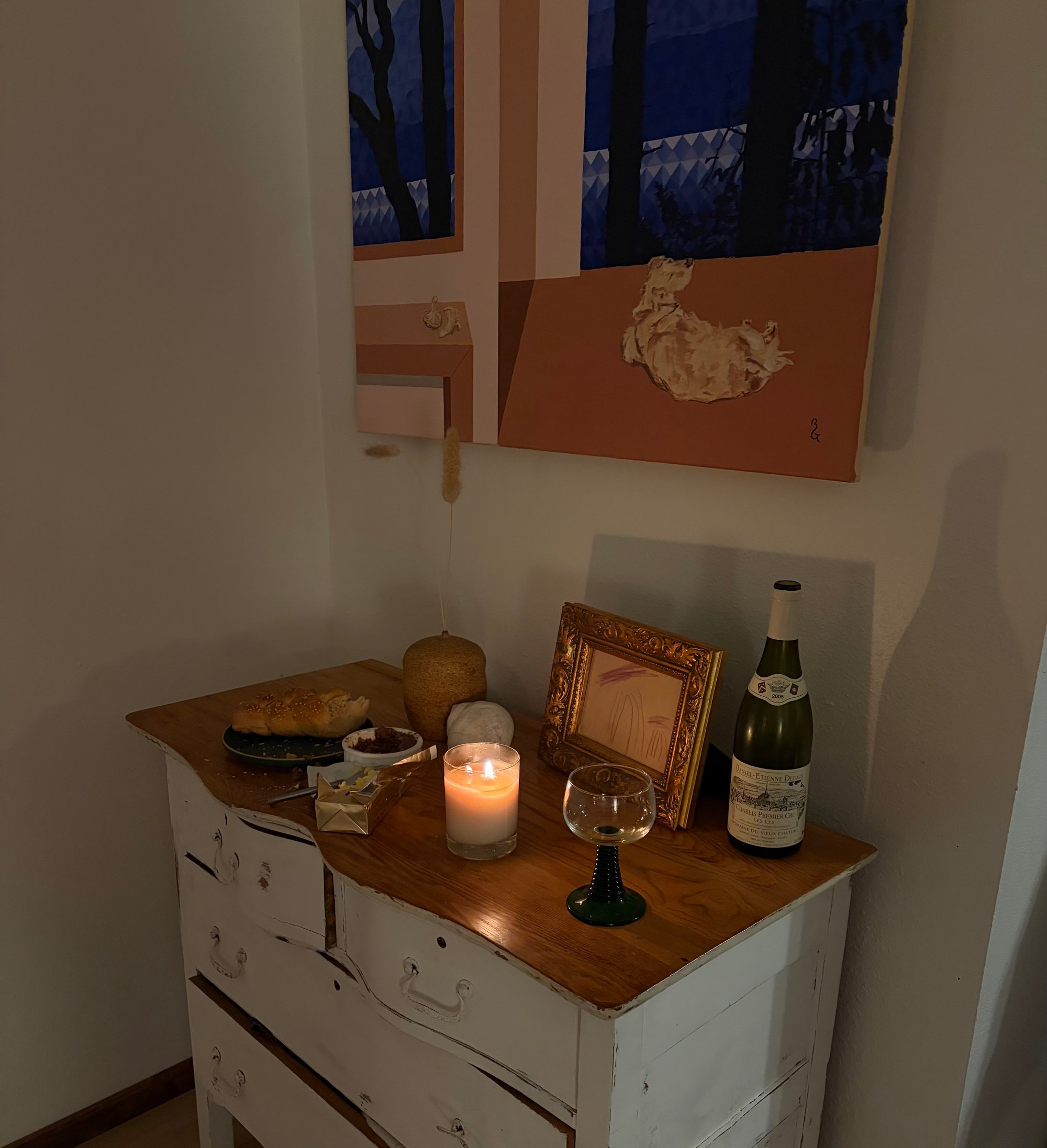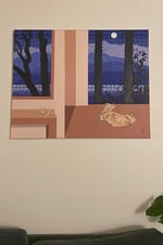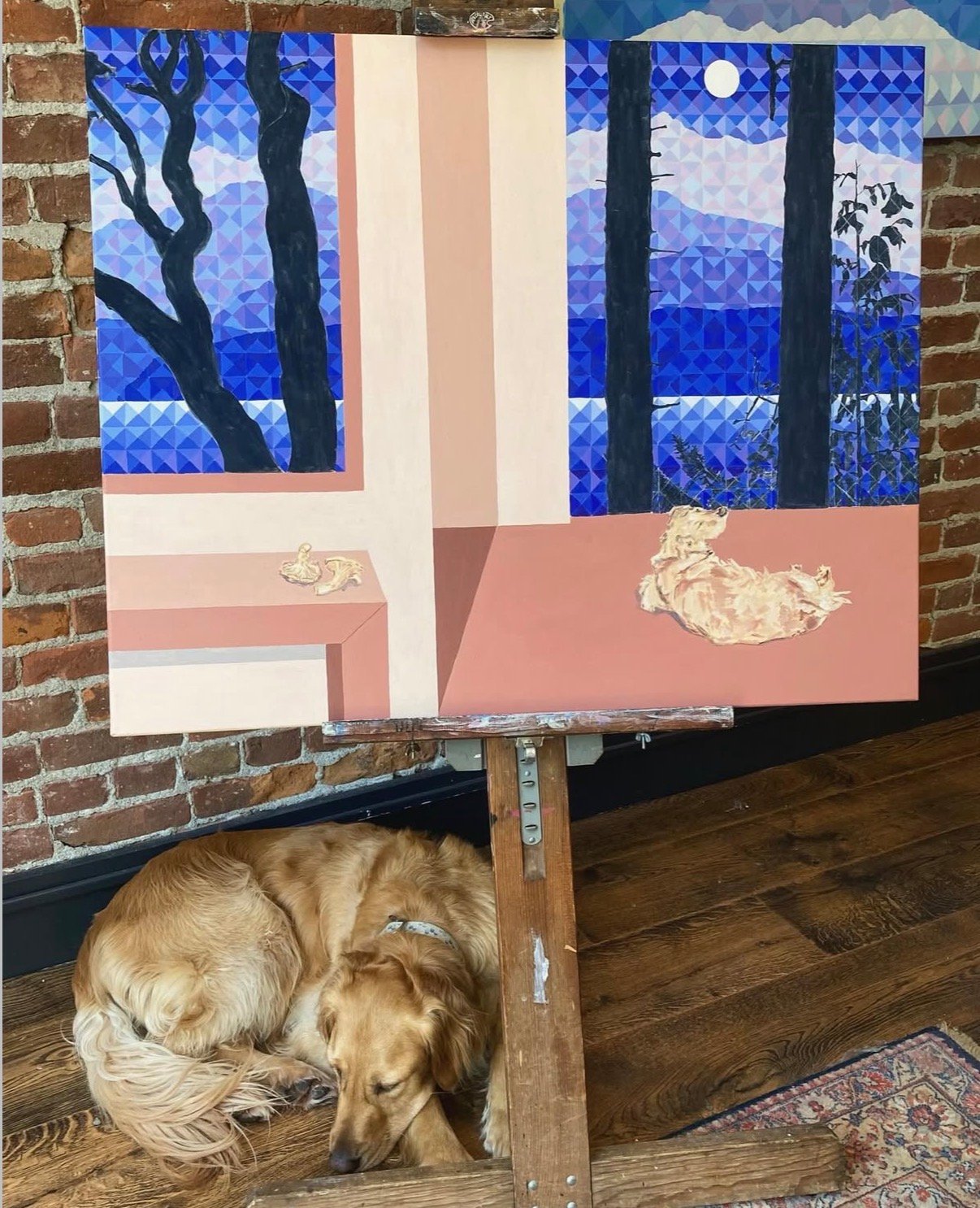 This is an original oil painting is a visual ode to PNW fall days and a special Golden Forager who is always willing to spend entire days finding chanterelles with me in the forest. He seems to be a good luck charm for finding them (perhaps because they match). In this painting is resting in front of Discovery Bay under the full moon. A pair of chanterelle mushrooms sit on the table beneath a painting of the view.