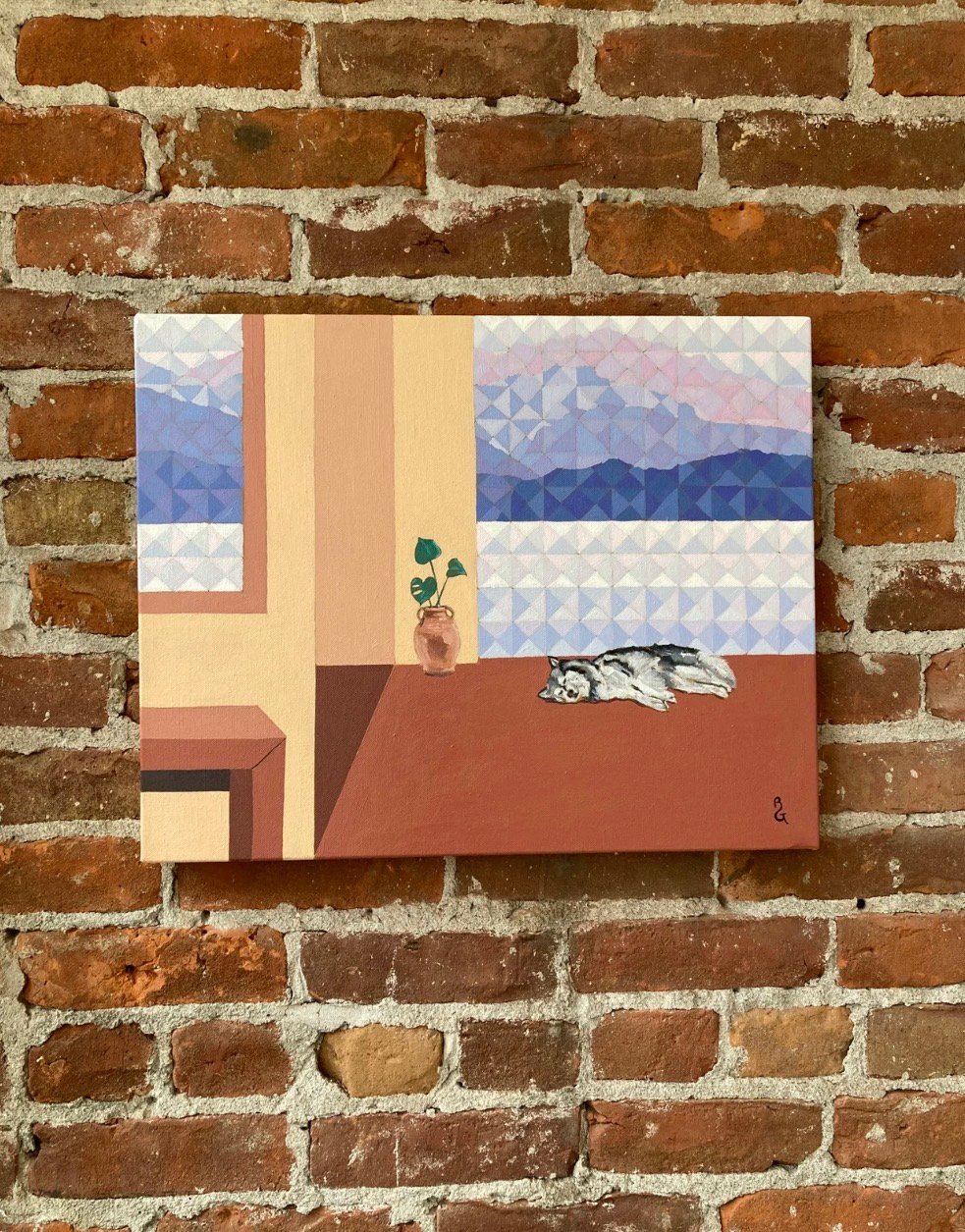 This oil painting features PT Uptown pup Tulsi under her monstera starts in the glow of Discovery Bay during her favorite time of year.