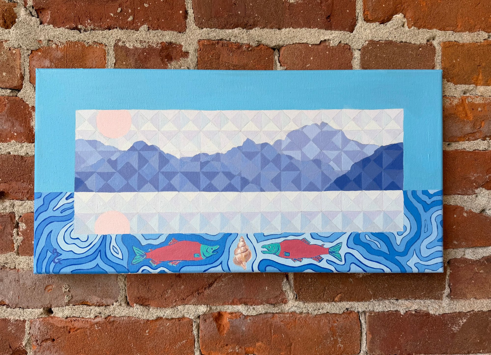 This 10” by 20” oil painting features two Sockeye salmon swimming in waters below a pink moon and mountains of British Columbia’s Howe Sound.