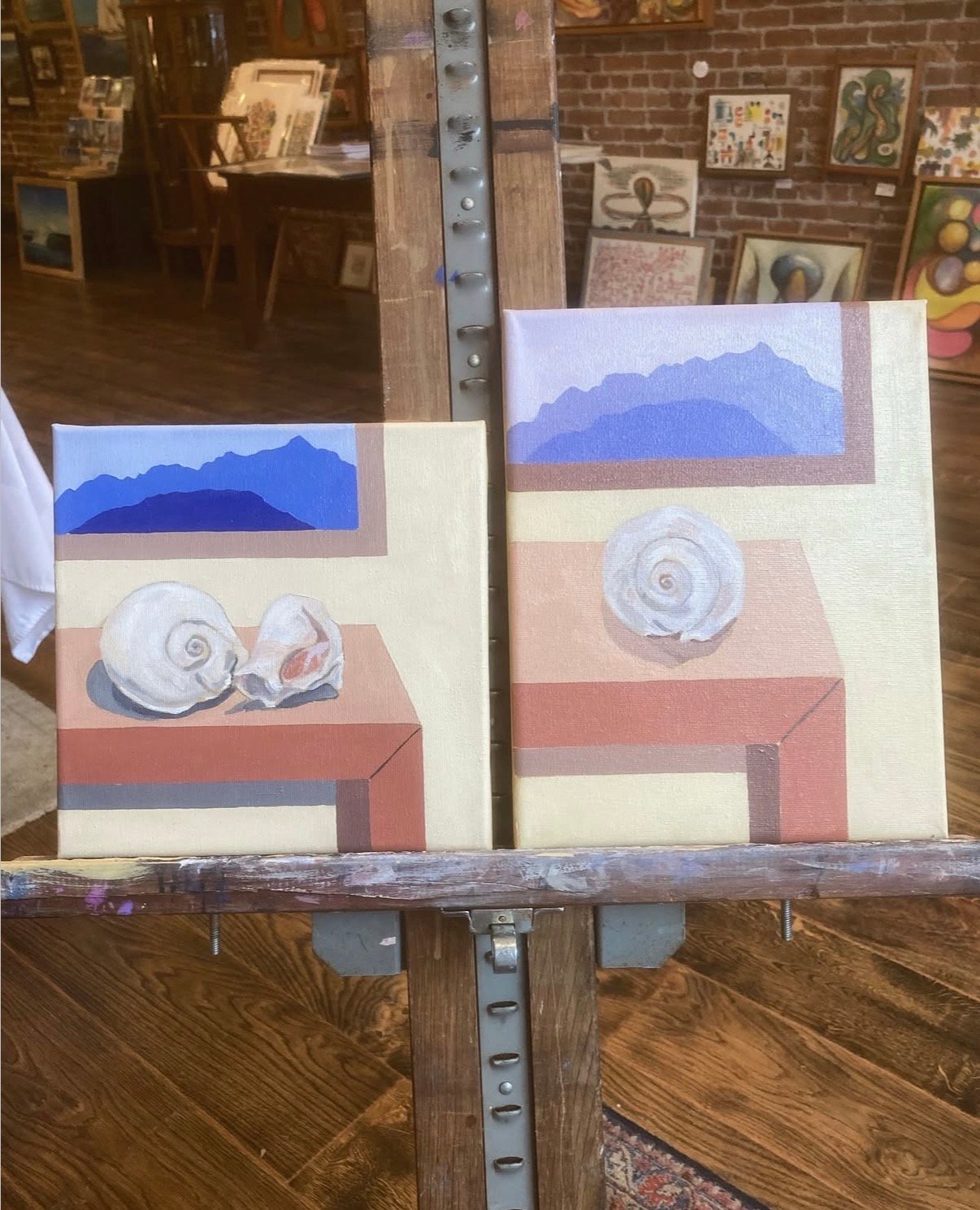 This painting is in oil on canvas measuring 8”x10”. It features one moonsnail shell on a shelf with a dreamy view of the Olympic mountains. Moonsnails appear in my home and work as my childhood was spent beachcombing for them on Bainbridge Island.